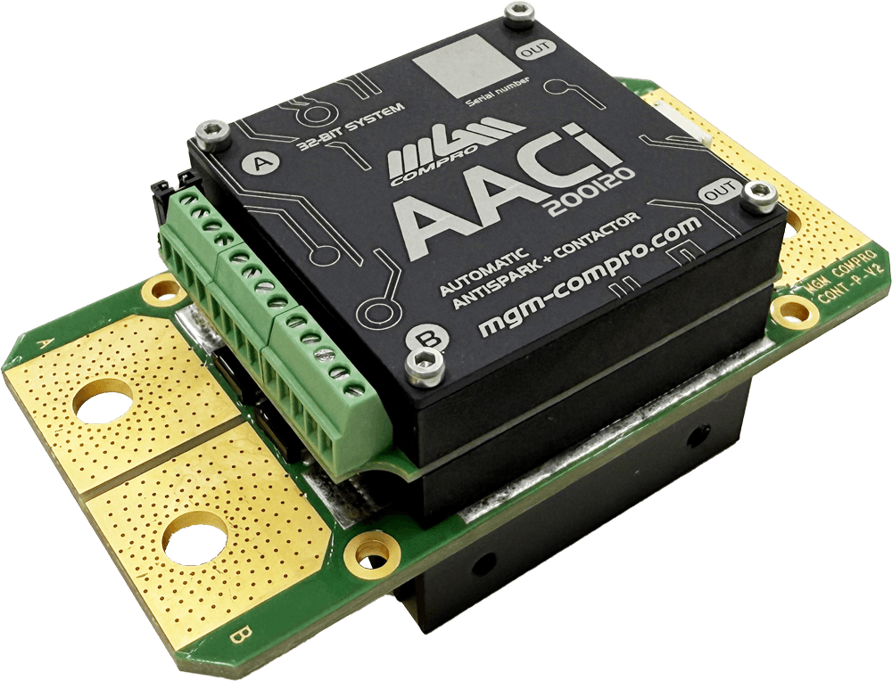 AACi modules are designed exclusively for the power connection/disconnection of loads (e.g. controllers and battery systems) in DC circuits. They are a very advantageous substitute for conventional mechanical contactors as they are significantly lighter and smaller. They require considerably less power control energy. Semiconductor contactors are equipped with a built-in antispark circuit that prevents sparking of contacts/connectors when connecting capacitive loads to power supplies (e.g. blocks of DC bus capacitors used in electronic speed controllers / inverters). This unique feature simplifies overal circuits and reduces their size and complexity. Our semiconductor contactors can operate with one-way or bidirectional operational conditions, depending on the chosen connection diagram. They also offer several modes of operation and uses, ranging from fully automatic to fully controlled by an external controller.